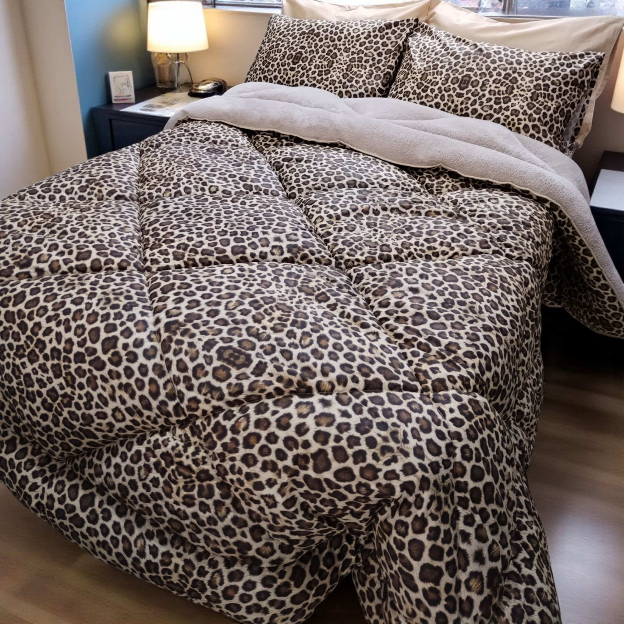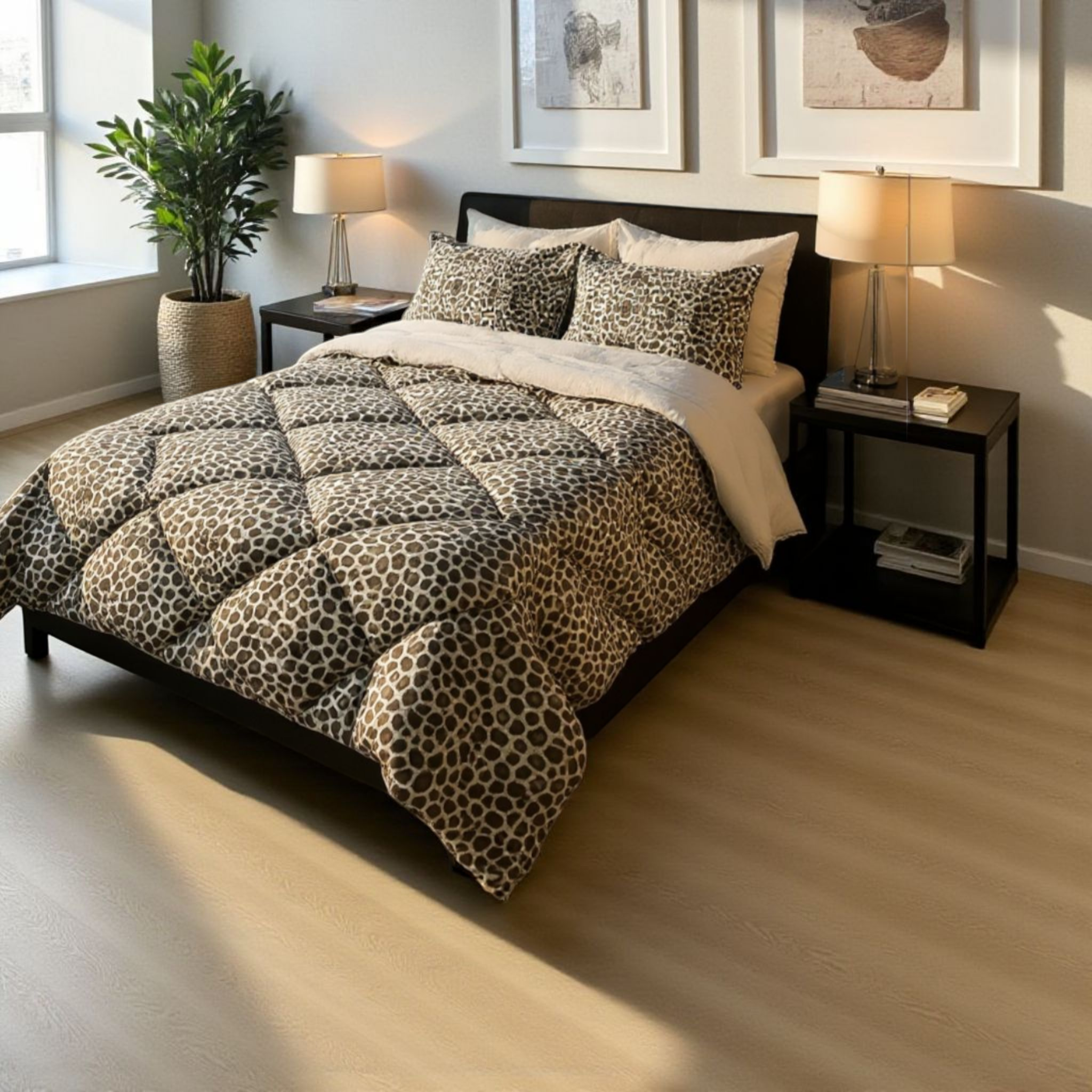 Leopar deseni, iç mekanınıza modern ve şık bir dokunuş katarken, odanın atmosferini canlı hale getirir. Bu set, yalnızca konfor odaklı değil, aynı zamanda estetik bir seçimdir. Yatak odanızda yarattığınız ortamı tamamlar, misafirlerinizi etkileyerek göz alıcı bir görünüm sunar.